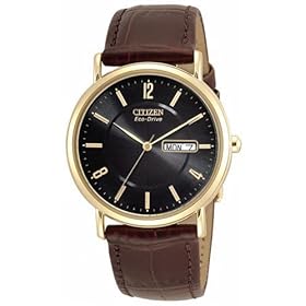 A men's Eco-Drive timepiece at its' best. The gold tone stainless steel case, brown leather and simple black dial, bring every outfit together. The timepiece is highlighted with day/date indicator, gold tone stainless steel hour indicators and water resistance.