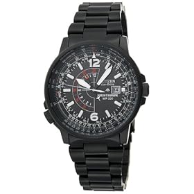 Large and in charge, the Citizen Nighthawk men's stainless steel pilot watch will add a soaring accent to business and casual wear. It includes a standard slide rule as well as a pilot's slide rule, which can be used for flying distance and other navigation calculations. The round black watch case has a brushed finished with a thin-edged bezel framing the black dial background, and it measures 42mm (1.65 inches) wide and 12mm (0.47 inches) deep. It's accented by large luminous white hands, thin white baton markers, and Arabic numerals at 6 and 12 o'clock. This watch is completed by a stainless steel link bracelet band with a black finish, which is joined by a push-button fold-over clasp with safety. Other features includes a dual-time function for tracking a second time zone, large date display at 3 o'clock, scratch resistant mineral crystal with anti-reflective coating, and water resistance to 200 meters (660 feet).
