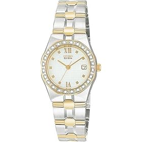 Diamonds and silver and gold tones enrich this luxurious timepiece from Citizen. The classic duo of silver and gold tones on the stainless steel band enhances the beauty of the diamond-studded gold-tone bezel, which tops a 24-millimeter-in-diameter silver-tone stainless steel case. A subtly textured white dial features a sophisticated mix of gold-tone Roman-numeral hour indicators and square hour markers. Gold-tone hands and a gold-tone framed date window at the three o'clock position round out the warm yet cool look of this Citizen watch, which is rated water resistant to 100 feet.