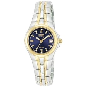 A ladies' Eco-Drive timepiece at its' best. The smooth two-tone stainless steel case and bracelet and simple blue dial, brings every outfit together. The timepiece is highlighted with date indicator, gold tone stainless steel hour indicators and water resistant to 100 meters.