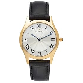 Glittering with a highly polished 14 karat gold watch case, this Movado timepiece for men eschews that spare design that's become its hallmark for a more classic look, but it still lives up to Movado's horological pedigree with a precise Swiss-made quartz movement and luxurious attention to detail. The solid 14 karat yellow gold watch case frames a silver dial face, that includes a patterned center, a full Roman numeral display, and a pair of hands.