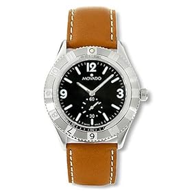 This handsome watch from Movado's Gentry collection offers a sporty blend of function and style. It features a round black dial with bold Arabic numerals at 3, 9, and 12 and bar markers elsewhere. A subdial at the 6 o'clock position registers the seconds, and luminous hands and markers make the dial easy to read, even at night. The dial is framed by a stainless steel bezel with engraved hour markers and attractive coin-edge detailing. The watch is set in a 36 mm solid steel case and presents on a handsome brown leather strap with contrast stitching and a buckle clasp. Other notable features include a scratch-resistant sapphire crystal and precise Swiss quartz movement. This Movado watch is water resistant to 30 meters.Product Features