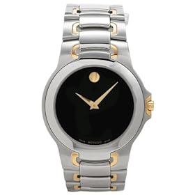 The Meza men's watch by Movado provides the ultimate in urban sophistication. A single dot marks the 12 o'clock hour, showcasing the minimalist style this designer is known for. The black dial is held within a 36-millimeter case and is protected by a scratch-resistant sapphire crystal. It is paired with a beautiful two-tone band that fastens with a pushbutton clasp. This watch is water resistant to a depth of 100 feet and powered by Swiss-quartz movement.Product Features