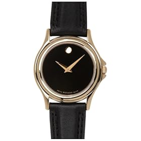 This classic Museum dial watch showcases Movado's celebrated minimalist design. The round black dial is punctuated with gold-toned Dauphine hands and a single concave dot marker at the 12 o'clock position. This signature dial, famously introduced for Movado by American designer Nathan George Horwitt in 1947, is intended to evoke images of a sun dial, with the dot representing the sun at high noon. The black dial is set off beautifully by a gold-toned stainless steel case and bezel. A black leather strap with a buckle closure completes the sleek and sophisticated look. Other notable features of this watch include a scratch-resistant sapphire crystal, precise Swiss quartz movement, and water resistance to 30 meters.