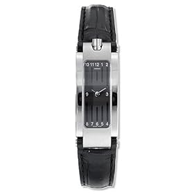 The striking contemporary design of this Movada watch will keep you ahead of the fashion curve. The watch features an elongated, black rectangular dial with two small silver tone hands and small numbers arranged horizontally along the edges. The dial is set in a curved stainless steel case and presents on a black leather alligator strap that fastens with a buckle closure. This watch features a scratch-resistant sapphire crystal and Swiss quartz movement. Water-resistant to 100 feet, it can be worn while swimming or poolside diving, but it should not be worn while scuba diving.
