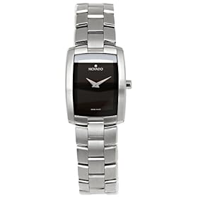 A stylish variation on Movado's signature Museum dial watch, this sophisticated-looking women's watch features a gently curved rectangular black dial, measuring 24.5mm by 30mm, with silver-toned hands and a single small dot marker above the Movado logo. The dial is set in a stainless steel case and bezel and presents on a stainless steel bracelet-style band. The band fastens with an invisible double-locking clasp. This watch features a scratch-resistant sapphire crystal and Swiss quartz movement. Water-resistant to 100 feet, it can be worn while swimming or poolside diving, but it should not be worn while scuba diving.Product Features