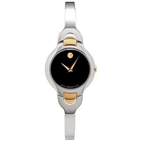 This elegant two-tone dress watch from Movado's Kara series has a bold Museum dial and a slender, graceful silhouette. The black dial has gold-tone Dauphine hands and single concave dot marker at the 12 o'clock position. This is Movado's signature dial, made famous by American designer Nathan George Horwitt in 1947. Horwitt intended his design to be evocative of a sun dial, with the dot representing the sun at high noon. The dial is framed by a round steel bezel. Graceful curved gold-tone lugs secure the case to a slender silver-tone bangle bracelet that fastens with a jewelry clasp. Other notable features of this watch include precise Swiss quartz movement and a highly scratch-resistant sapphire crystal. Water-resistant to 30 meters, this watch can withstand splashes and brief immersion in water; however, it is not sufficiently resistant for swimming.