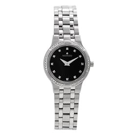 Perfectly styled for accompanying both business wear and evening couture, this women's Movado Metio Swiss quartz timepiece is impressive enough on its own, but it ratchets up the style points with a bezel accented with sparkling tiny white diamonds (36 in total). It also includes an additional 12 diamonds set as hour markers on the dial face. Featuring the utterly recognizable, minimalist look of the Museum Watch, made famous by American designer Nathan George Horwitt in 1947, its black dial includes just the signature single dotted marker at 12 o'clock--evocative of a sun dial--and two sword-shaped hands. (Movado's Museum watch is often referred to as the "boss's watch" due to its vague display of time and because the boss doesn't have to be on time.)