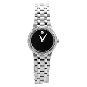 Perfectly styled for accompanying both business wear and evening couture, this women's Movado Metio Swiss quartz timepiece is impressive enough on its own, but it ratchets up the style points with a bezel accented with sparkling tiny white diamonds (36 in total). Featuring the utterly recognizable, minimalist look of the Museum Watch, made famous by American designer Nathan George Horwitt in 1947, its black dial includes just the signature single dotted marker at 12 o'clock--evocative of a sun dial--and two sword-shaped hands. (Movado's Museum watch is often referred to as the "boss's watch" due to its vague display of time and because the boss doesn't have to be on time.)