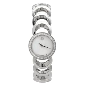 The glittering bezel frames a sultry silver mother-of-pearl dial face that includes two black sword-style hands and Movado's signature single dotted marker at 12 o'clock--evocative of a sun dial. It also features a highly scratch-resistant sapphire crystal and water resistance to 30 meters (100 feet)--enabling it to withstand splashes and accidental dunks into the water, but not suitable for swimming. Product Features