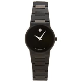 Dark and mysterious, this Safiro stainless steel Swiss quartz watch for women is finished with a black PVD coating (Physical Vapour Deposition), which provides a fashionable exclamation point as well as improves wear and corrosion properties. The complementary deep black face features the utterly recognizable, minimalist look of the Museum Watch, made famous by American designer Nathan George Horwitt in 1947. It includes just the signature single dotted marker at 12 o'clock--evocative of a sun dial--and two silver sword-style hands. (Movado's Museum watch is often referred to as the "boss's watch" due to its vague display of time and because the boss doesn't have to be on time.)