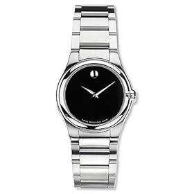 The Movado Women's Viro Watch is an exquisite timepiece that features Movado's signature museum dial and hour marker at the 12 o'clock. The deep black dial is offset beautifully with silver tone hands and the watch's 26 millimeter diameter stainless steel case and bezel. A stainless steel bracelet with a hidden double-locking clasp rounds out the design details of this fine timepiece. The watch runs on Swiss quartz precision movement, has a virtually scratch-proof sapphire crystal, and is water resistant to 100 feet.