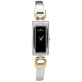 Perfectly styled for accompanying your most fashionable evening wear, this two-toneMovado Vivo stainless steel Swiss quartz dress watch for women features a slim profile that won't overpower the rest of your jewelry. Demure and delovely, it's complemented by a silver stainless steel bangle-style bracelet featuring a brilliantly polished shine and gold-plated connectors at the top and bottom.
