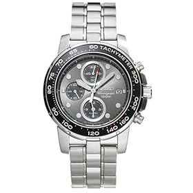 Quartz movement, Alarm chronograph, Dress watch, Dial has 3 gray subdials for alarm, minutes and seconds, Alarm can be set on a 12-hour basis with two small hands, Chronograph can measure up to 60 minutes in 1/5 second increments, after 60 minutes it will start counting again from 0 repeatedly up to 12 hours, Alarm hands can indicate the time in a different time zone, Date display at 3, Luminous hour markers, Gray outer ring has white stick minute markers, Silver-tone luminous hands, Red timer hand, Hardlex crystal, Black bezel with embossed silver-tone tachymeter, Stainless steel crown and selector buttons, Screw-down stainless steel caseback, 100 meters/330 feet water resistant