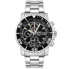 This Seiko Submariner men's watch combines precision chronography with a timeless and stylish design. The sleek 21-millimeter-wide bracelet with a fold-over-clasp-with-safety, transitions effortlessly into the classic round 46-millimeter case, both of which are constructed of stainless steel with a bright, polished silver finish. Encased safely inside a scratch-resistant Hardlex crystal, the jet-black dial perfectly accentuates the light-catching, LumiBrite hands and hour markers, and is bordered by a black stainless-steel, rotating bezel with markers to measure elapsed time. This sophisticated timepiece also sports a date window at 3 o'clock, and three subdials for measuring seconds and minutes, and for setting an alarm. As resilient as it is refined, this analog watch is driven by a precise quartz movement, and is water resistant down to 330 feet.