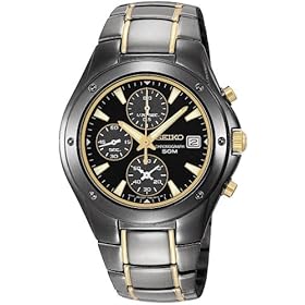 This men's Titanium Carbon Nitrate plated Seiko watch features a chronograph dial which can measure split and accumulated elapsed time. The chronograph can also measure up to 12 hours in 1/20 seconds. Watch is water resistant up to 50 meters.