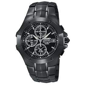 The Seiko Men's Coutura Alarm Chronograph Watch features a unique alarm subdial for enhanced functionality. Constructed with a stainless steel case, the watch includes a black stainless steel stationary bezel, and a black stainless steel link bracelet with a secure push button clasp. A durable sapphire window shields the black dial face, which features silver-tone hour indexes, and three chronograph subdials that track the minutes and seconds in addition to offering a specialized alarm function. This quartz-powered timepiece is equipped with a convenient date calendar at three o'clock and is water resistant to 330 feet. It is presented in a luxuriously padded Seiko case.