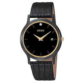 Quartz movement, Dress watch, Gold-tone hands, Silver-tone indices, Genuine diamond at 12 o'clock, Gold-tone bezel liner, Analog date display, Black titanium carbon nitride plated bezel and case, Gold-tone stainless steel crown, Stainless steel caseback, Hardlex crystal, 30 meters/100 feet water resistant