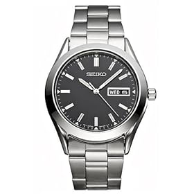 This handsome stainless steel men’s watch is the perfect blend of style and function. It features a classic-looking round black dial with three silver-colored hands and simple bar markers. The hands and markers glow brightly without drawing energy from a battery thanks to environmentally-safe Lumibrite technology. The watch has a day/date window at the three o’clock position and features a scratch-resistant Hardlex crystal and a screw-down caseback. It secures to a bracelet-style stainless steel band that fastens with a fold-over clasp. Water-resistant to 30 meters, this watch can handle splashes of water or rain, but it should not be worn while swimming or diving. It has a battery life of five years.