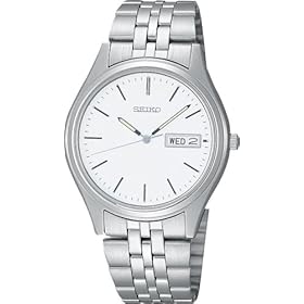 Add a touch of class to any ensemble with the clean, contemporary design of the Seiko SGF523 stainless steel men's watch. The round silver stainless steel watch case, which is fully integrated into the link bracelet band. The silvery white dial background has thin stick dial markers, small minute indexes that surround the outer dial, and luminous silver hands (with second hand). It also features a day/date function at 3 o'clock. Other features include Japanese quartz movement, a scratch-resistant Hardlex crystal, 5-year battery, and water resistance to 30 meters (100 feet).This Seiko watch is covered by a limited 3-year manufacturer's warranty (includes 1st year worldwide coverage with 2nd and 3rd years valid only in the United States). This warranty does not cover the strap, crystal, watch bracelet, battery, or any watch accessory. This includes, but is not limited to, any pouch or belt attached to the watch. If the watch is repaired or serviced by anyone other than Seiko, the warranty becomes void.