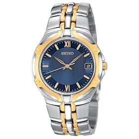 Stylishly powerful, the Seiko SGE514 two-tone stainless steel men's watch will add a bold emphasis to your business wear. The large, round watch case measures 1.45 inches in diameter. It features a slightly raised bezel that mixes silver and gold-tone stainless steel and has scalloped accents. The gold-tone accents flow into the center of the integrated, contoured bracelet band. The midnight blue dial background has a Guilloche-textured center, a mix of gold dial markers and Roman numerals, and gold baton hands (with second hand). Other features include Japanese quartz movement, date function at 3 o'clock, water resistance to 30 meters (100 feet).This Seiko watch is covered by a limited 3-year manufacturer's warranty (includes 1st year worldwide coverage with 2nd and 3rd years valid only in the United States). This warranty does not cover the strap, crystal, watch bracelet, battery, or any watch accessory. This includes, but is not limited to, any pouch or belt attached to the watch. If the watch is repaired or serviced by anyone other than Seiko, the warranty becomes void.