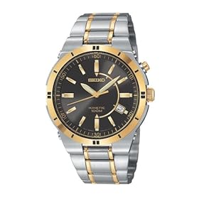 The Seiko Men's Kinetic Two-Tone Watch includes bold gold-tone hour indexes and a gold-tone bezel with black hour markers for a polished appearance. The timepiece is constructed with a stainless steel case, a gold-tone-stainless-steel bezel with black hour indexes, and a two-tone-stainless-steel link bracelet with a secure push-button-fold-over clasp. A durable hardlex window shields the black dial face, which features gold-tone hour markers, gold-tone minute indexes, and gold-tone Arabic numeral seconds indexes. The dial also includes gold-tone watch hands and a date calendar at four o'clock. This Japanese-kinetic-powered timepiece is water resistant to 330 feet. It is presented in a luxuriously padded Seiko case.