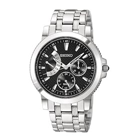 Presenting an uncompromising precision, this Seiko Men's Le Grand Sport Silver-Tone Watch #SNT001 features a dramatic black dial face, which is encased and protected by a sapphire dial window. Silver-tone hour and minute indexes bring a pleasant contrast, and an additional ring of Arabic numerals ensures an easy-to-read functionality. For further time-telling convenience, three sub-dials mark the day, date, and 24-hour clock. A silver-tone stainless steel band is accompanied by a push-button-clasp closure, and other details include a silver-tone, stationary, stainless steel bezel and a 39-millimeter stainless steel case. Exemplifying your ideals, this sleek timepiece embodies your ambition. Powered by Japanese quartz movement, this watch is water resistant up to 165 feet.All stainless steel Cabochon crown Sapphire crystal Clasp - Deployment, Push Button Release Retrograde day indicator 31-day calendar display 24-hour display Water resistancy-50M Style# SNT001