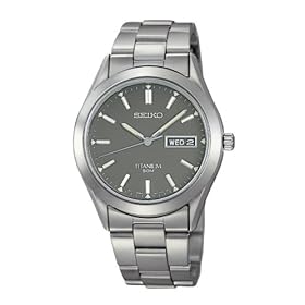 Spruce up your look with this men's titanium watch by Seiko. The gray dial with silver tone hands and markers lends a striking appearance and the day/ date display offers added convenience. 50 meters water resistant.Quartz movement, Analog day/date display in English/Spanish, Screw-in caseback, Hardlex crystal, Silver-tone luminous hands and stick markers, 50 meters/165 feet water-resistant