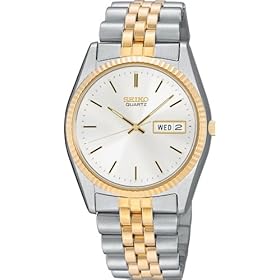 This classic-looking watch has a round light silver dial set in a bezel of fluted gold-toned stainless steel. It features three-hand function with luminous hands and markers, an English/Spanish day-date window at the three o’clock position, and Japan quartz movement. The bracelet-style stainless steel band has a fold over double-locking clasp. This watch is water resistant to 30 meters.
