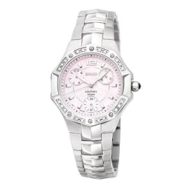 A stylish timepiece, the elegant looks of this Seiko Coutura women's watch are matched only by its precision performance. The stainless-steel band with a bush-button clasp sports a polished silver finish, and connects to a brilliant bezel that is sure to draw attention with its 20 inlaid diamonds. Light-catching, LumiBrite silver hands and markers rest atop a pink, mother-of-pearl dial, and are kept safe in a case that brandishes a cabochon crown, and a scratch-resistant sapphire crystal. This watch also boasts a beautiful, triple-dial layout, with a multi-hand calendar, and a 24-hour display. With a sophisticated finish that belies its resiliency, this watch is driven by an analog-quartz movement, and is water resistant down to 330 feet.