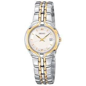 Unique details and classic styling make this Two-Tone Dress Watch from Seiko a sure bet for any sophisticated woman. Featuring a lightly-patterned white dial, gold-tone Roman numerals at six and 12 o'clock, stick indices, and three slender hands, this timepiece combines gold- and silver-tone stainless steel in its 27-millimeter case, stationary bezel, and bracelet band. Also offering a durable hardlex crystal, reliable Japanese quartz movement, and a convenient fold-over-push-button clasp with a safety, this watch is water resistant to 100 feet and is protected by a three-year manufacturer warranty.